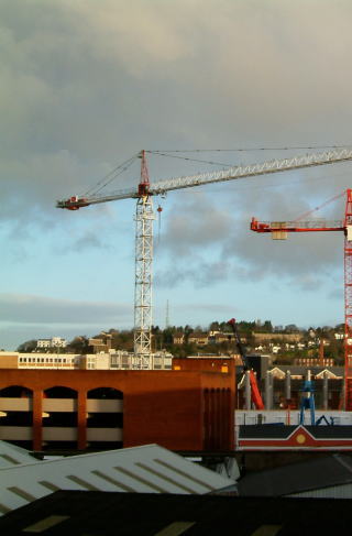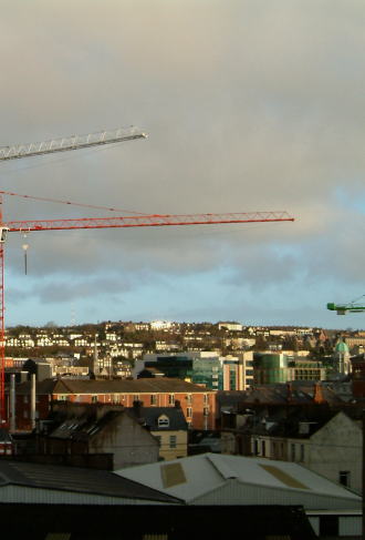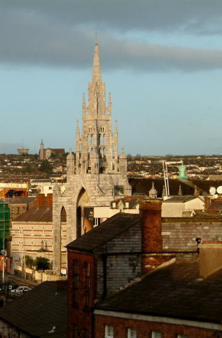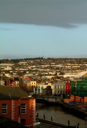 上の写真は、ニチアイのオフィスの真北。市街地の中心部のやや東寄りになります。ご覧の通り、クレーンが目立ちますので風景を壊していますが、気が利いたことに、クレーンにもクリスマスのライトアップがなされ、夜は結構綺麗なのです。昨晩は、コーク2005のフィナーレを飾る花火が盛大に上がりました。あいにくの大雨でしたが、恐らく大勢の人出があったことでしょう。わざわざ出かけなくても、花火を見るだけなら、実はここニチアイのオフィスが一等地。クレーンのライトの間に花火が映えて、とても綺麗でした。実は大雨だったので、最初は雷かと思ったのですが・・・ 下の写真は、当社オフィスから斜め左下、市街地方向やや西寄りです。下にリー川と橋が一つ、見えています。この橋を渡って右手に行くと、サウス・マル(South Mall)へと出ます。川の右に大きな教会が目だっていますが、コークの中では特別に有名なものでもない、ホーリー・トリニティー教会。有名な、セント・フィンバーズ大聖堂は、この写真よりはるか左、シャンドンの鐘は、もっと右手になります。 |