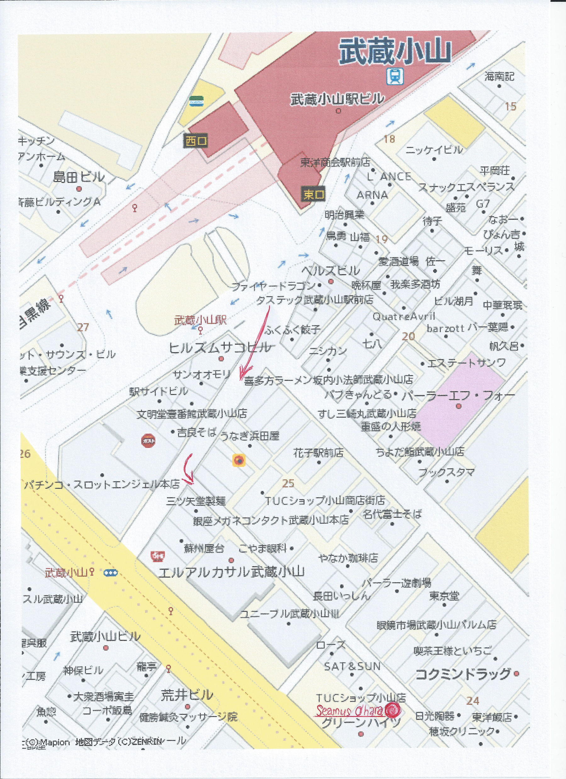 会場のご案内 > シェイマス・オハラ (Seamus O'hara) 住所:東京都品川区小山3-24-14 地図(PDF)・地図(JPEG画像) 電話:03-6421-5656 ウェブサイト:http://www.anthill.co.jp/seamus_ohara 最寄り駅:東急目黒線武蔵小山駅から徒歩3分(JR目黒駅から武蔵小山まで2駅4分) 行き方:武蔵小山駅の東口を出て、駅前広場向かいにあるアーケードのパルム通り商店街へ。向かって左右2つのアーケードのうち右の方(コージーコーナーの左側)へ行きます。1分弱で、左手に大阪名物串かつでんかなと、和そばがあるので、その間を左折、その路地を1分ほど行くと、右側にあります。 |